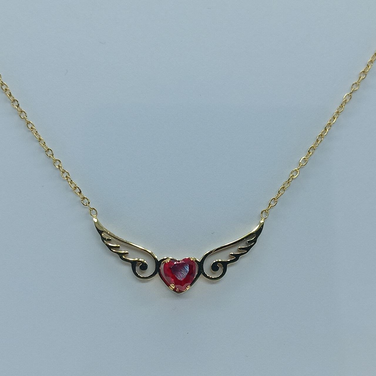 Ce collier doré allie délicatesse et symbolisme. Son pendentif en forme d’ailes, rehaussé d’une pierre rouge éclatante en cœur, incarne l’amour, la liberté et la féminité.
